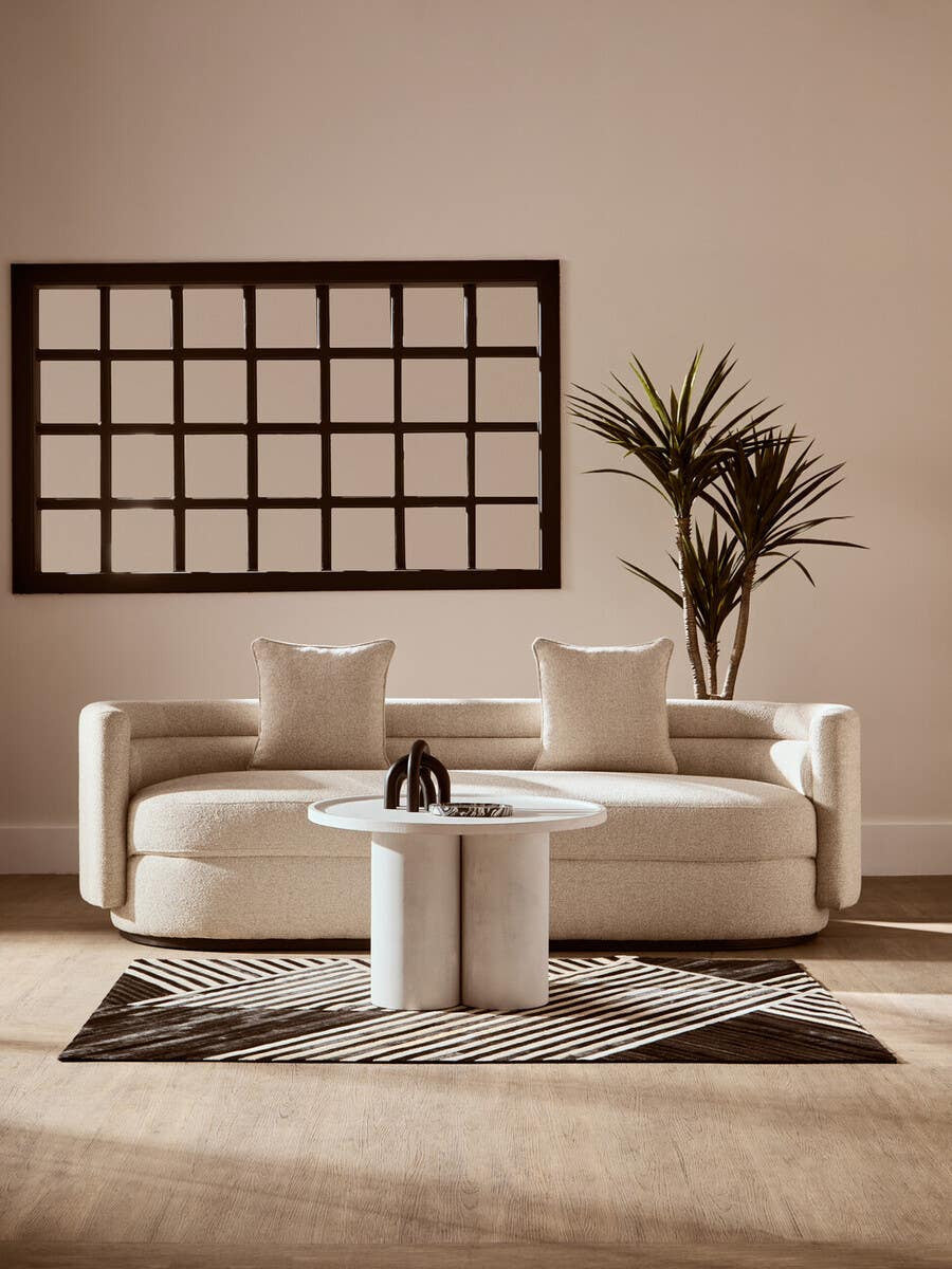 This luxury large monochromatic rug is crafted from genuine hair on leather patches, arranged in a stripped abstract pattern with a tactile texture, offering a stylish look to modern spaces.