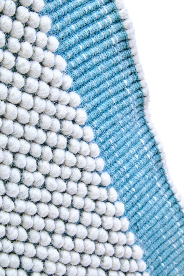 This hand-tufted rug is defined by its striking depth and texture, achieved by overlaying a dense field of plush white pebble-like bobbles onto a flat-woven blue base. The vivid blue and crisp white colors ensure it acts as a bold accent piece, adding both visual interest and exceptional comfort to a room.