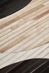 This large hair-on-leather rug is made from genuine cowhide patches, hand stitched together to create a bold abstract geometric pattern with rich black and warm tones. The natural variations in the leather create a rich tactile surface, while the contrasting black and warm hues add depth and visual interest. This rug is a stylish statement piece that blends modern sophistication with a hint of organic charm. Black with embedded warm tones.
